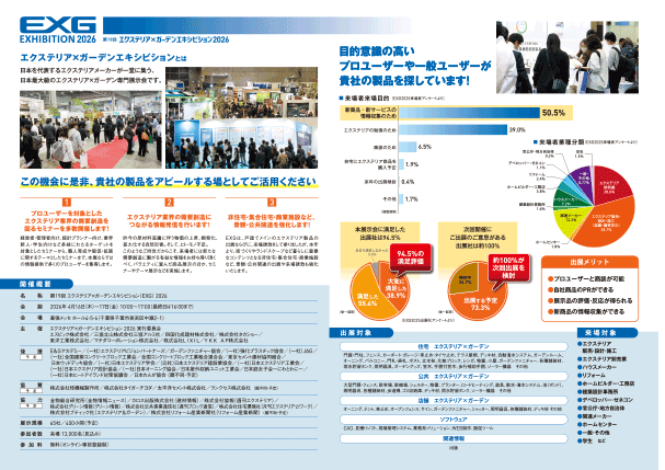 EXGは戸建てメインのエクステリア製品の出展ならびに、来場誘致をしてまいりましたが、本年より、街づくりやランドスケープなど暮らしに重要なコンテンツとなる非住宅・集合住宅・商業施設など、景観・公共関連の出展や来場誘致も強化いたします。